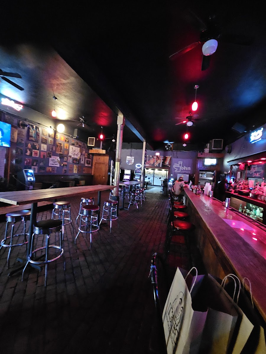 The John Layout/atmosphere *Dive bar; 24 hours; cash only; high tops in center of room; video poker machine; album covers on the wall; one TV; internet jukebox; pool table and PAC Man arcade game in the back Food/drink *No food menu